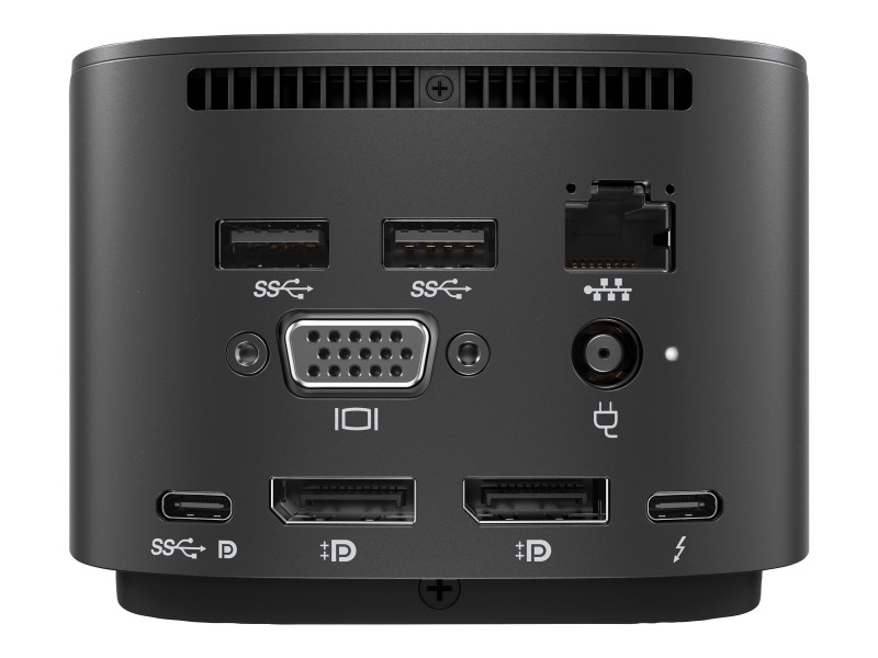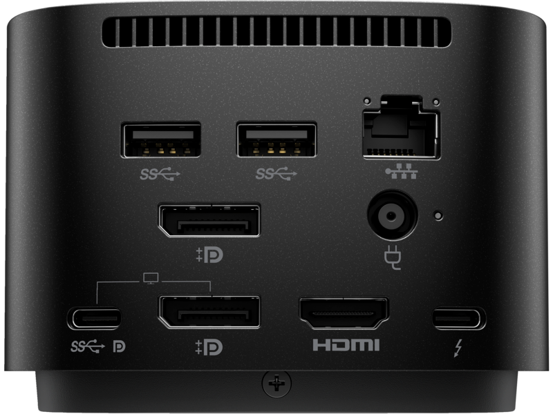 | Ports | Composants sur la partie supérieure : Voyant et bouton marche/arrêt pour allumer le système hôte ou le sortir de veille Composants sur la face avant : 1 sortie de données/courant USB-C, (données USB 3.2 Gen 2 10 Gbit/s uniquement) Composants sur les faces latérales : Côté droit : 1 emplacement pour dispositif anti-vol Kensington standard 2 ports USB 3.2 Gen 1 – un de chaque côté (charge) (5 Gbit/s) Composants sur la face arrière : 2 ports USB 3.2 Gen 1 (ports de charge lorsque l’appareil est dans la station d’accueil) (5 Gbit/s) 1 port HDMI 2.0 2 ports DisplayPort 1.4 1 port d’adaptateur secteur 1 port Ethernet 2 cartes réseau internes pour la prise en charge de l’Ethernet 1 Go et 2,5 Go 1 port DP Alt Mode USB-C 1 port Thunderbolt™ 4Le bouton marche/arrêt de la station d’accueil ne fonctionne pas lorsque celle-ci est connectée à des ordinateurs portables HP non pris en charge ou autres que HP. |